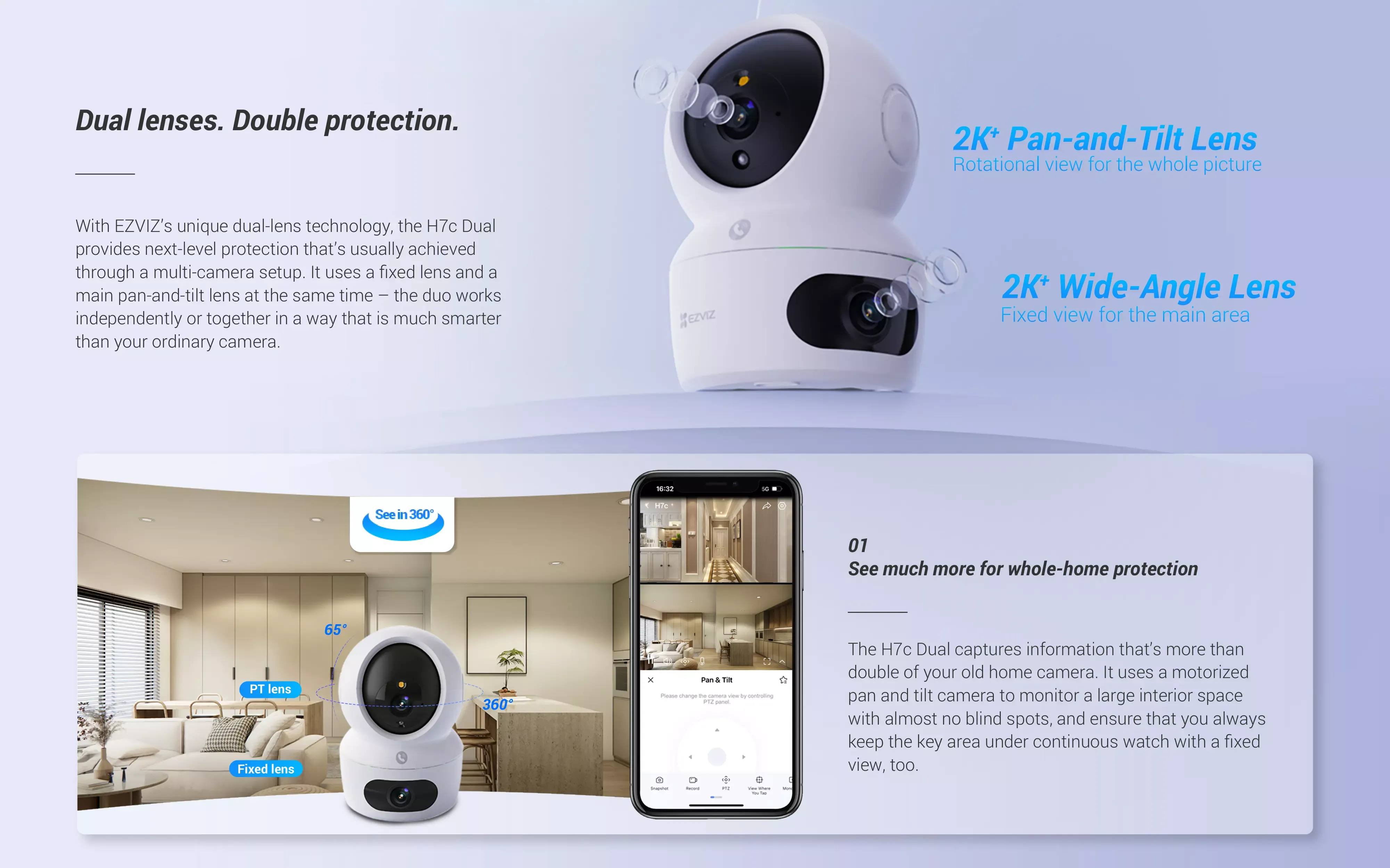 With EZVIZ’s unique dual-lens technology, the H7c Dual provides next-level protection that’s usually achieved through a multi-camera setup. It uses a fixed lens and a main pan-and-tilt lens at the same time – the duo works independently or together in a way that is much smarter than your ordinary camera.